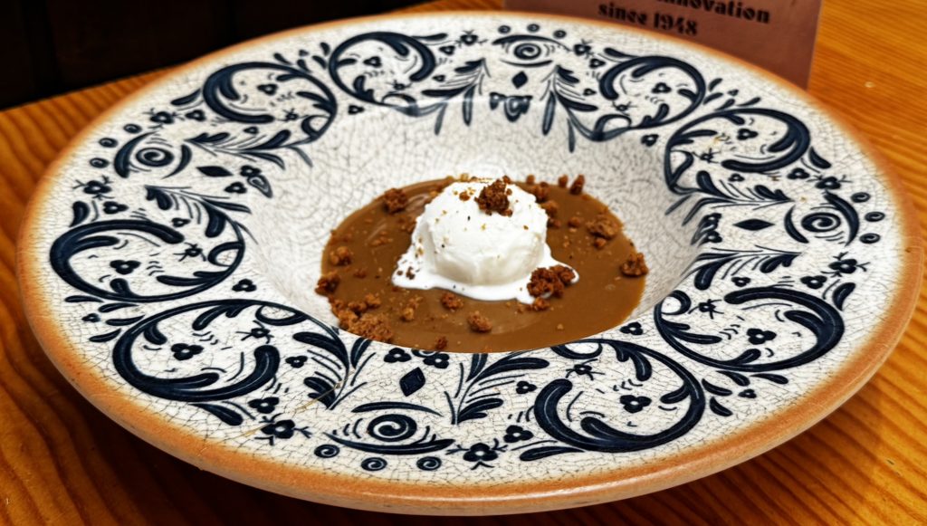Gachas de mosto con helado de queso azul de Calaveruela y crumble de canela/clavo